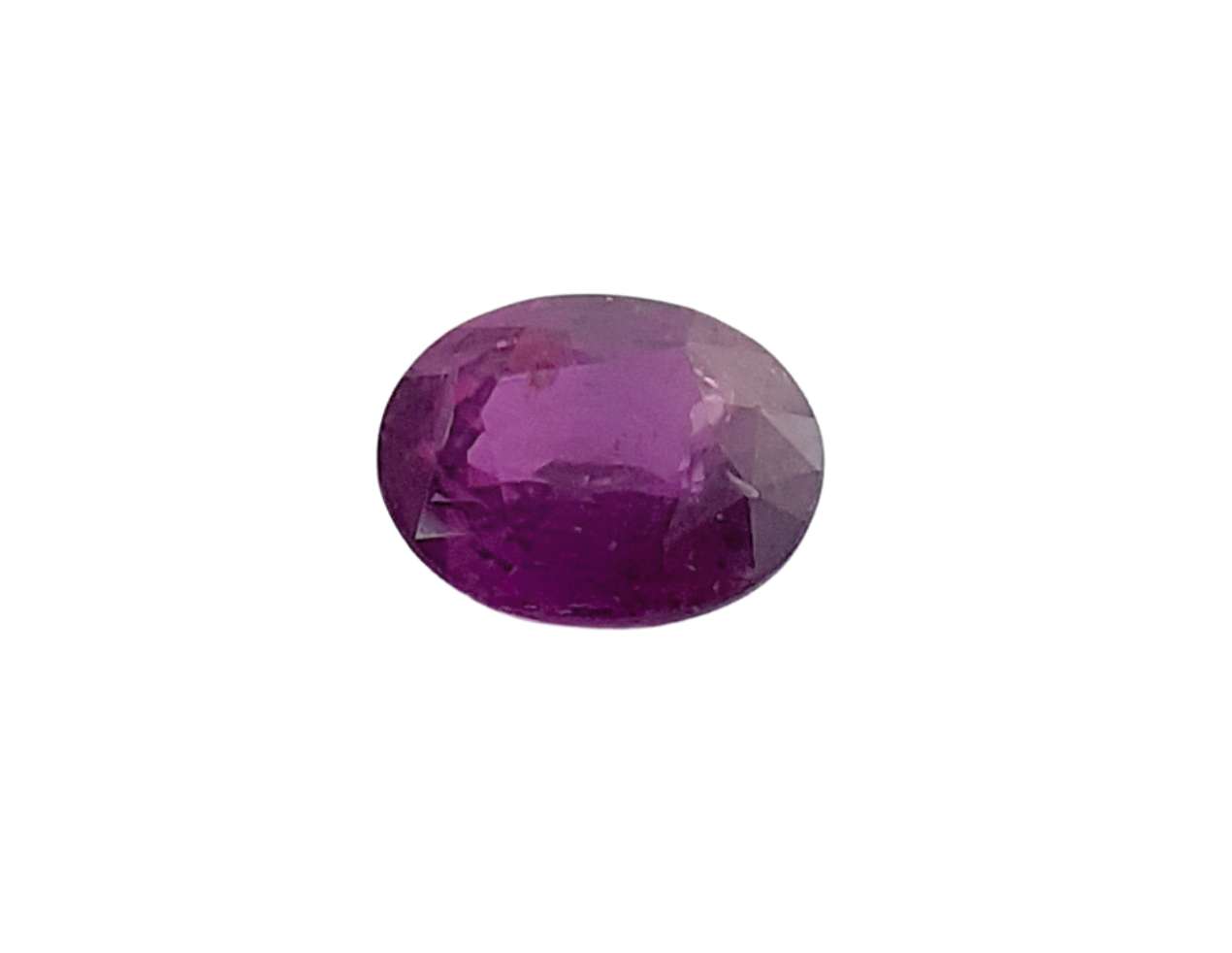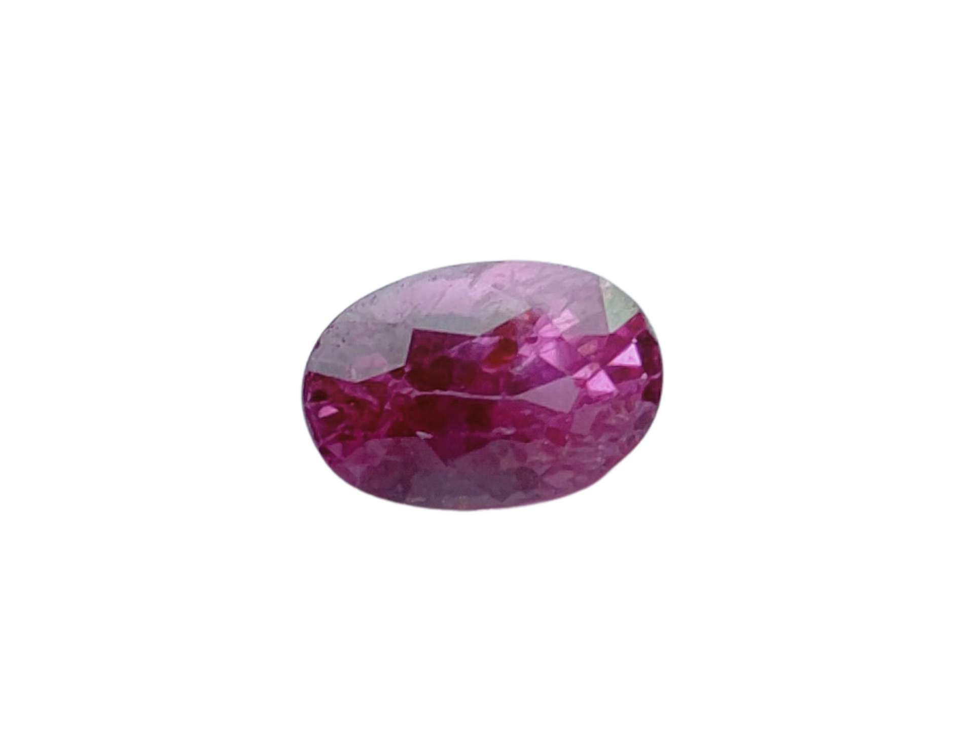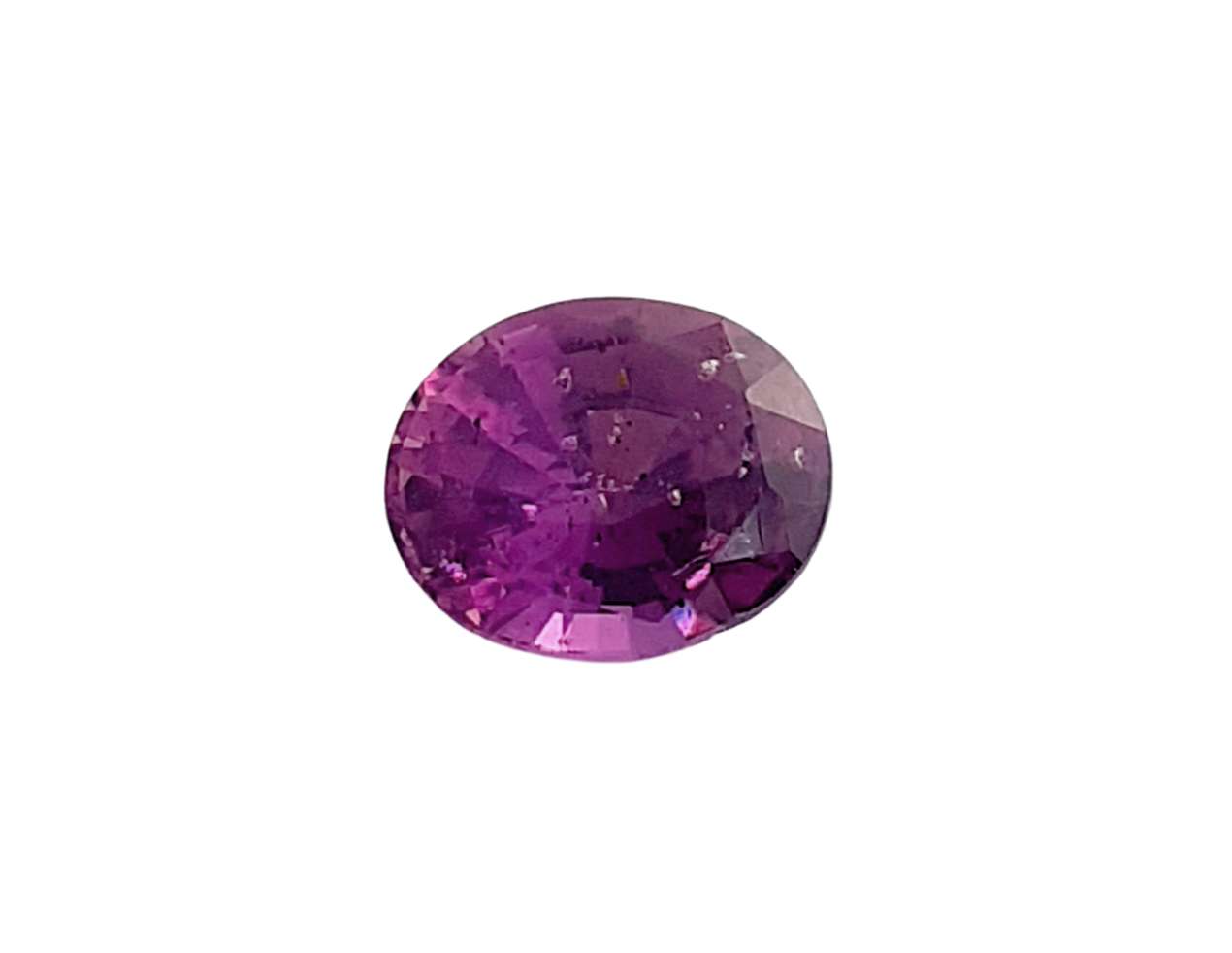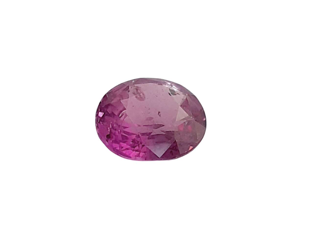 This elegant oval-shaped pink sapphire weighing 1.375 carats, showcasing a small open pique on top and delicate small white pique inside. A dainty gem, ideal for creating refined jewellery pieces.