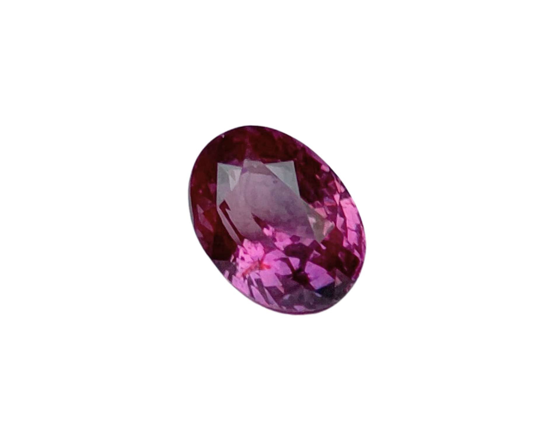 This oval-shaped pink sapphire weighing 1.034 carats, featuring a top one chip and intricate black and white inside piques. A unique gem, radiating a captivating pink hue, perfect for refined jewellery.